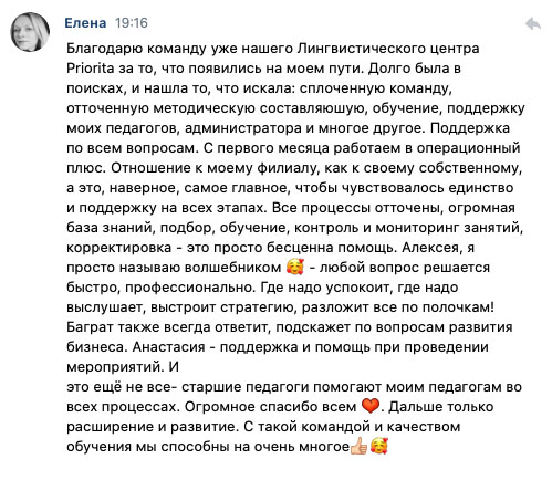 Обучение иностранным языкам — постоянно растущая сфера бизнеса, спрос в которой увеличивается с каждым годом на 120%. Priorita на рынке образовательных услуг с 2009 года. С тех пор мы открыли 6 крупных филиалов в г. Тюмени, стабильно приносящих доход свыше 1200 000 руб. в месяц, как и наши партнеры в других городах , которые каждый год растут и развиваются вместе с нами.