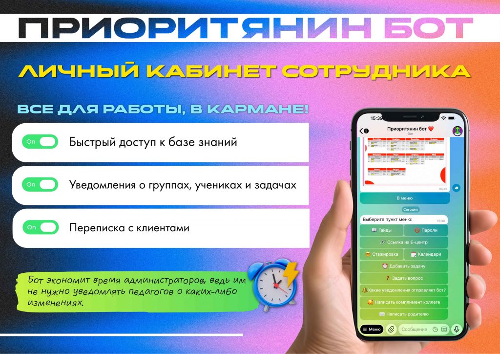 У нас также есть ТГ-бот для сотрудников, который уведомляет их о любых изменениях в CRM и дает быстрый доступ к базе знаний.