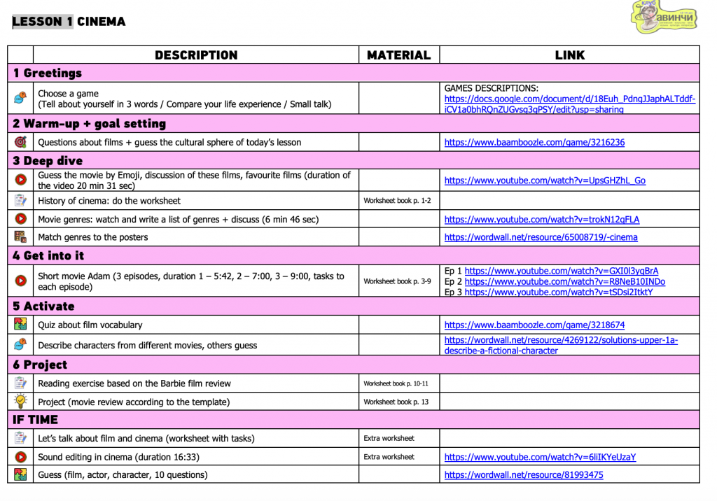 • поурочные планы 12 занятий с детально расписанными этапами, ссылками и реквизитом