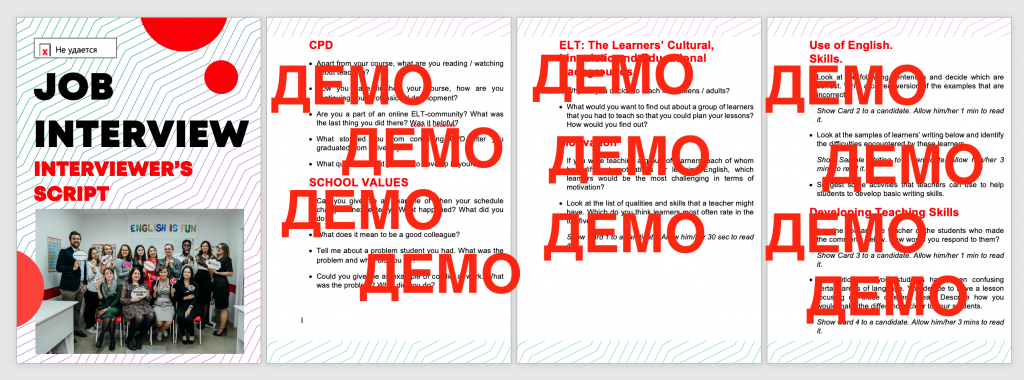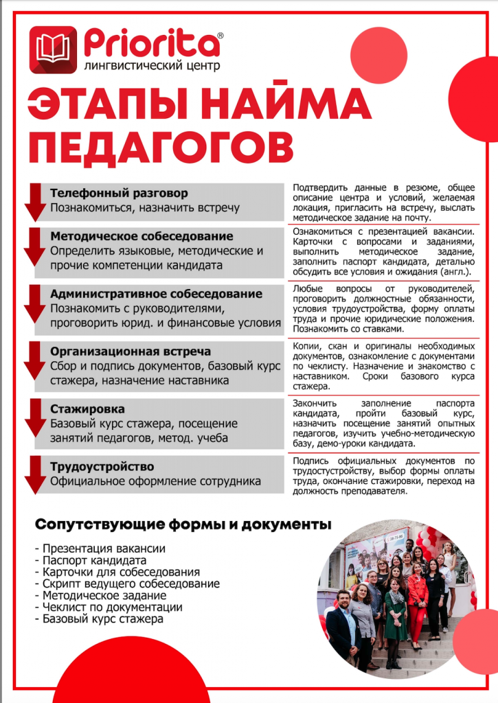 Полный набор материалов для собеседования преподавателей от презентации вакансии до скрипта собеседования, паспорта кандидата и чек-листа по документам. Priorita пользуется этой системой уже более 7 лет, она эффективно показывает навыки соискателя и помогает отбирать достойных кандидатов. Кроме того, материалы, выполненные в фирменном стиле вашей школы, помогут произвести дополнительное положительное впечатление на потенциального сотрудника.